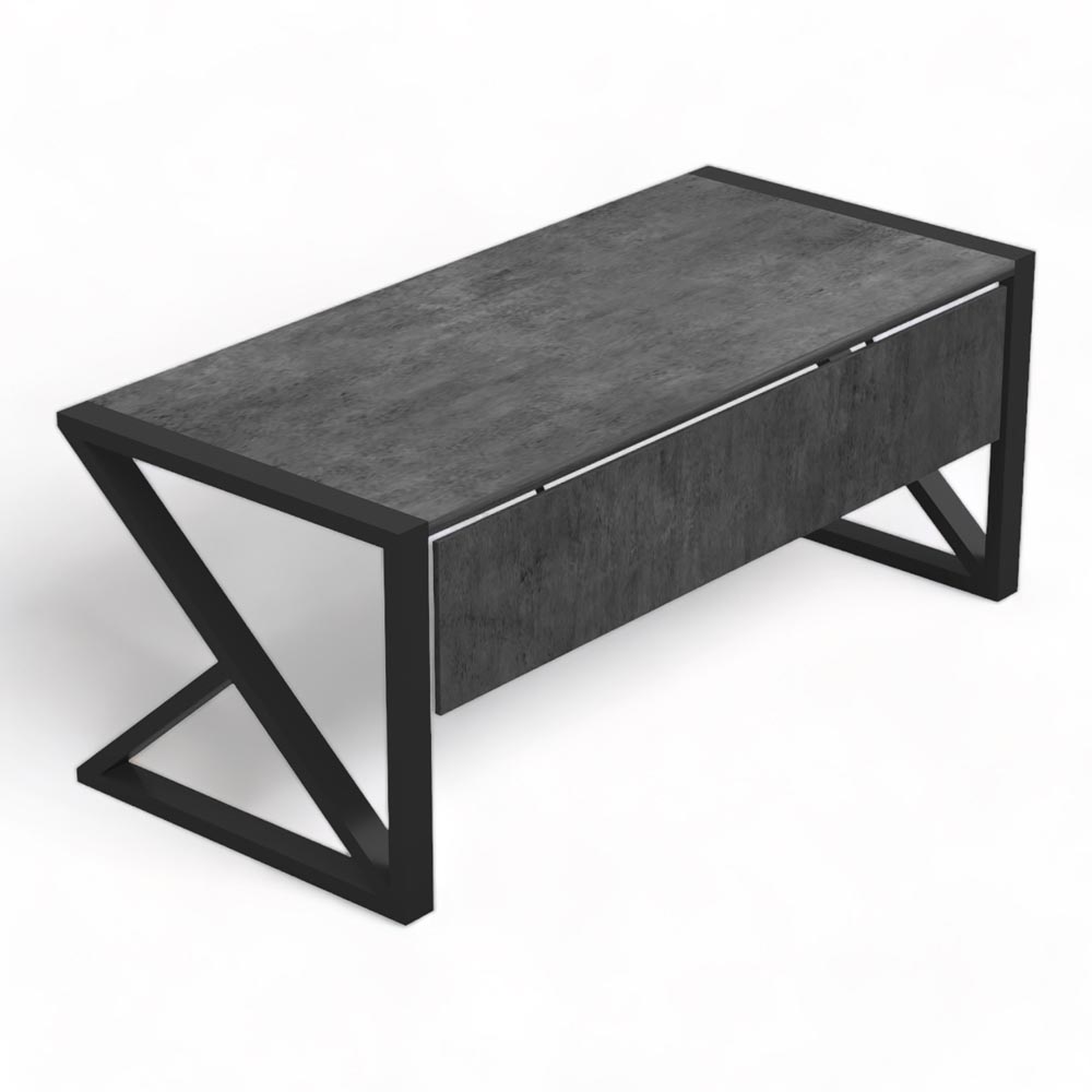 این میز که شاید در اولین نگاه، میز ساده‌ای به چشم بیاید؛ ولی وقتی که به جزئیات و ظرافت در طراحی آن متمرکز می‌شوید آن وقت است که پی به جذابیت فوق العاده آن می‌برید. این میز با ساخته شدن از ورقه‌های بزرگ ام دی اف (MDF) به شکل مستطیل در بخش رویی و در نمای روبرویی میز و اتصال آن‌ها به یکدیگر با کمک پروفیل‌های فلزی، ساختار ظاهری منحصر به فردی را ایجاد کرده است. دیگر مشخصه‌های خاص این میز، پایه‌های آن می‌باشد. طراحی خلاقانه از ترکیب پروفیل‌های فلزی به صورت ضربدری (X شکل) و استفاده از دو ورقه در بخش زیر صفحه رویی میز و اتصال پایه‌ها به زمین جهت افزایش ایستایی، جذابیت این میز را دو چندان کرده است.